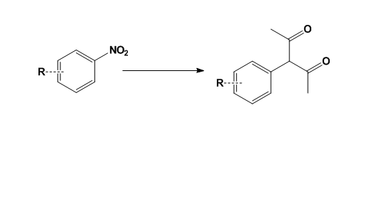 硝基苯本身在苯环上可以发生亲核取代,就像楼上讲的那样。但想把硝基取代下来是不太可能的,目前文献上也没这面资料,因为硝基与苯环是共轭的,N外的电子与苯环的电子云共轭,能力很强,基本无法被取代。上面的反应可以进行,但需要先把硝基转化成NH2,在把它给卤化。上面的反应是一个克莱森反应,需要的原料有乙酰丙酮,还有就是刚刚卤化了的卤代苯,催化剂用乙醇钠