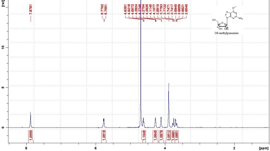 O6-methylguanosine:m.p. 113-115℃. 1H NMR (D2O), δ=7.87 (s, 1H), 5.7 (d, J=6.03 Hz, 1H), 4.6 (s, 2H), 4.60~4.66 (m, 1H), 4.26~4.28 (M, 1H), 4.10~4.11 (m, 1H), 3.89 (s, 3H), 3.65~3.77 (m, 2H) ppm. ESI-HRMS calcd for [C11H16N5O5+H+] 298.1151, found: 298.1150.