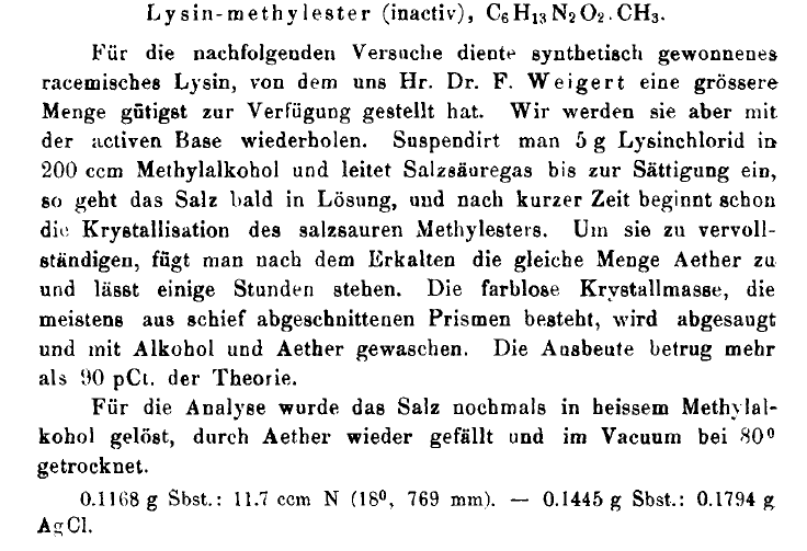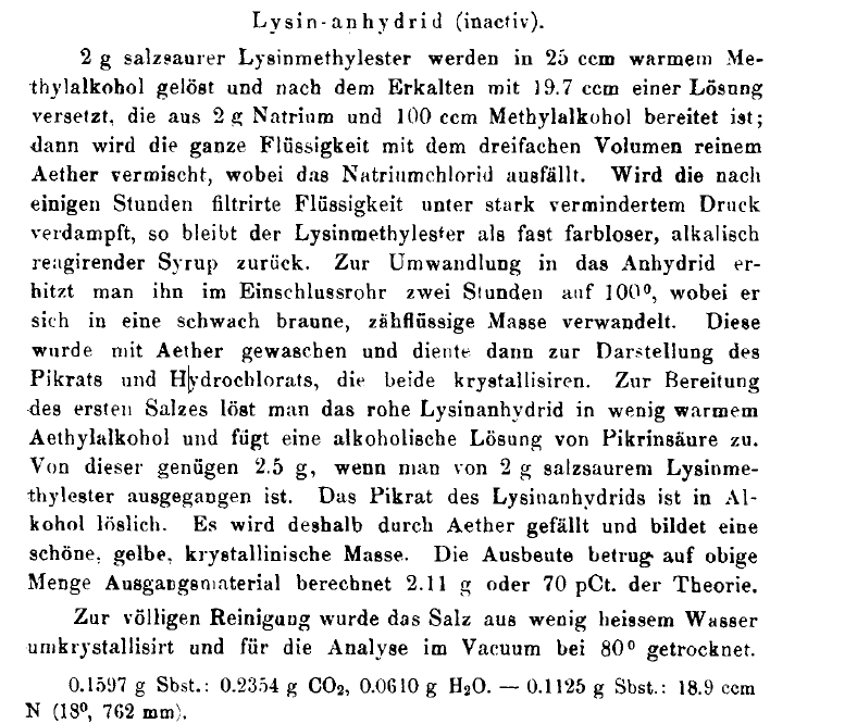 赖氨酸甲酯(非光学活性) 下面方法特别适合于人工合成的外消旋赖氨酸。Weigert 为我们提供了一个由外消旋赖氨酸制备更大量的赖氨酸甲酯的最有好的方法。但是,我们将要用光学活性的碱(即赖氨酸---译者)重复此实验。将5g赖氨酸悬浮在200ml甲醇中,通入氯化氢气直至饱和,盐就溶解了之后不久,就开始有赖氨酸甲酯盐酸盐结晶出来,为了结晶完全,冷却之后,加入等量的乙醚,搁置数小时。无色晶体大多有单斜体组成,抽滤,依次用醇,乙醚洗涤。收率,大于理论量的90%。分析样:将产物再先溶于热的甲醇里,用乙醚沉淀,80度下干燥。 赖氨酸酐(参见注—译者) 将2g赖氨酸甲酯盐酸盐溶于25ml热的甲醇中,冷却后用19.7ml由2g金属钠与100ml甲醇制得的溶液处理,然后总个溶液与3倍体积的纯乙醚混合,此时立即有氯化钠沉淀。数小时后,过滤出来的液体在强真空下浓缩,遗留下来的赖氨酸甲酯为几乎无色呈碱性反应的糖浆物。为了将其转化为酸酐,在封管内与100度加热两小时,此时变为浅棕色柔软的液状物, 它就用来制备苦味酸盐与氯酸盐。这两个盐都易结晶。要制备苦味酸盐就将粗酸酐溶于少量热点乙醇里,然后往醇溶液里加苦味酸。如果是从2g赖氨酸甲酯盐酸盐开始合成,那加2.5g苦味酸就够了。苦味酸盐溶于乙醇,因而可通过往醇溶液加乙醚来沉淀,它就形成漂亮的黄色结晶。从上述的2g原料可得到2.1g的产物,收率为理论量的70%。要完全纯化可从少量热水成重结晶,分析样品于80度真空干燥。 [注]:原文应译为酸酐,但从过程来看,产生的很可能是酰胺。 |