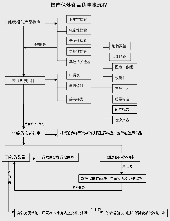 看一下保健食品的网站吧:http://www.cfs.gov.cn/cmsweb/webportal/W213/index.html 《保健食品注册管理办法(试行)》(局令第19号) (2005-04-30) 保健食品管理办法 (1996-03-15) 2010外国及港澳台保健食品进口到中国注册手续完全指导手册 【相关文章:1.保健食品注册全攻略2.进口保健食品申报攻略3.2009全新保健食品申报注册功略4.新旧《保健食品注册管理办法》对比看5.中国保健食品批件注册手续完全指导手册6.国产保健食品批件注册手续完全指导手册7.进口保健食品注册手续简章8.国产保健食品注册手续简章9.保健食品注册问答】 本手册为有志于进口保健食品到中国的经销商和境外企业提供政策及程序上的友情指导。 北京 核心提示: 1. 所有保健食品(无论国产进口),必须到中国国家卫生部进行备案申请(具体主管部门:国家食品药品监督管理局食品许可司),地方局无权审批; 2.中国保健食品分为营养素补充剂和功能性保健食品两大类,其中功能性保健食品又分成27种,两大类及27种功能的申请周期和费用都是有区别的,甚至区别较大,另外进口产品和国产产品之间的申请费用也有很大差距。所以只有确定了产品拟申报的功能才能做出有参考价值的预算。 3.中国官方对于保健食品的概念排除了其治疗功效,所以凡是治疗的产品请注册药品;中国自2000年前后已取消“保健药品”,目前的保健食品只具有保健功能,称为“国食健字”号,亦即通常所说的“小蓝帽”,且只为入口的产品。外用产品请酌情申请化妆品、医疗器械或药品。 4.保健食品注册的申请不是直接向SFDA提交,而是要先做检测,检测合格才能向SFDA提交申请(这个好像不算是问题,但经常有客户问,所以列在这里)。 5.保健食品申请费用是按单个产品计算的,也就是说只要产品名称不同就要申请,而不是某一个品牌或某一系列产品只申请一个文号(有的系列可以进行特殊申请)。这点比较重要,因为太多人问过这个问题。 6.保健食品批文有效期为5年,5年后需要进行再注册(延续),再注册时国家不收费。 批文:进入中国市场的第一步 随着中国市场的不断开放和中国加入WTO,众多外国(包括港澳台)企业看好中国巨大的保健食品消费市场,许多外国保健食品都想进入中国。外国保健食品进口中国市场之前都必须接受国家卫生部门的审批,取得国家食品药品监督管理局(SFDA)颁发的《保健食品批准证书》(以下简称《批文》),然后才能办理进关等手续。未领取《批文》的产品无法入关。无批文的产品不得在大陆市场销售,否则一经查处将受到严厉处罚。所以,申请保健食品“国食健字J********”批文是外国保健食品进口到中国市场的第一步。 一、什么是保健食品,如何分类? 在中国,保健食品是指:经国家食品药品监督管理局批准生产和销售,声称具有特定保健功能(27种)或者以补充维生素、矿物质为目的的食品。即适宜于特定人群食用,具有调节机体功能,不以治疗疾病为目的,并且对人体不产生任何急性、亚急性或者慢性危害的食品。 保健食品分为两大类,一类是功能性保健食品,另一类是营养素补充剂。 (1)功能性保健食品,是指具有27种功能之一或其中几种功能的保健食品。 27种功能包括:增强免疫力、对辐射危害有辅助保护功能、改善睡眠、增加骨密度、缓解体力疲劳、对化学性肝损伤有辅助保护功能、提高缺氧耐受力;缓解视疲劳、祛痤疮祛、祛黄褐斑、改善皮肤水份、改善皮肤油份;辅助降血脂、辅助降血糖、辅助降血压、对胃粘膜有辅助保护功能、抗氧化 、辅助改善记忆、促进排铅、清咽、促进泌乳、减肥、改善生长发育、改善营养性贫血、调节肠道菌群、促进消化、通便。 (2)营养素补充剂,是指以补充维生素、矿物质而不以提供能量为目的的产品。其作用是补充膳食供给的不足,预防营养缺乏和降低发生某些慢性退行性疾病的危险性。 未来SFDA新的注册办法有可能对营养素补充剂实行备案制管理;可能会删除一些功能,有的功能须增加功能试验,并且允许申报的功能范围和评价原则将会根据情况随时调整。所以建议申请人应选择可靠的保健功能申报,不要贪多、求新。 二、申报进口保健食品的程序怎样? 境外合法的保健食品生产商才可以申请注册保健食品批文,并且这个产品需要在生产国(地区)生产销售一年以上,申报的时候须要委托其境内办事机构或中国境内代理机构办理。产品首先要在国家指定的检验机构进行规定项目的检验,然后向国家食品药品监督管理局申请注册,国家局初审受理之后会组织配方、工艺、检验等方面的专家召开审评会对产品资料进行技术审评,提出意见。待意见公布后,申请企业应对专家提出的意见进行补充、修订,最后符合国家注册要求的产品将等待国家局的行政审批,有严重问题的产品将不予批准。 三、注册保健食品批件的周期有多长时间? 在国外,保健食品多是实行备案制管理,不用进行申报,所以不需要很多费用和时间。但在中国是实行注册制管理的,所以和国外有较大区别。申报保健食品批件的周期是与产品申报的功能密切相关的,申报的时间1-2年不等,所以要具体产品具体分析。 外国企业应确定想要进入中国的这个产品准备申报何种功能,各项预算才能相对准确一些。 保健食品申报周期主要体现在以下几个方面: 1、检验周期 申报进口保健食品必须完成的检验项目有:安全性试验(