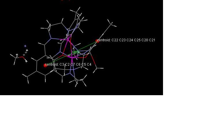 打开cif文件,显示结构图,选中环上的各个原子后,点Calculate>Centroids,计算出中心1,再选环2上的原子重复操作得到中心2,再点选中心1和2,右键单击选Measure>Distances即可,见下图。