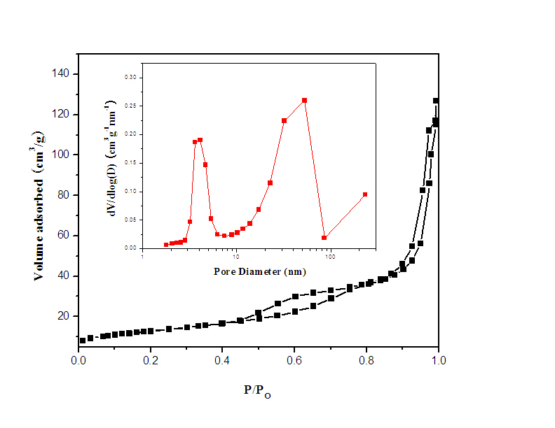 我的分析如下:N2物理吸脱附曲线中存在两个滞后环,低压区的滞后环对应孔径分布图中3-5nm的孔,此类孔主要是颗粒内部的一级孔;高压区的滞后环对应孔径分布图中20-80nm的孔,此类孔为由颗粒堆积而形成的孔。