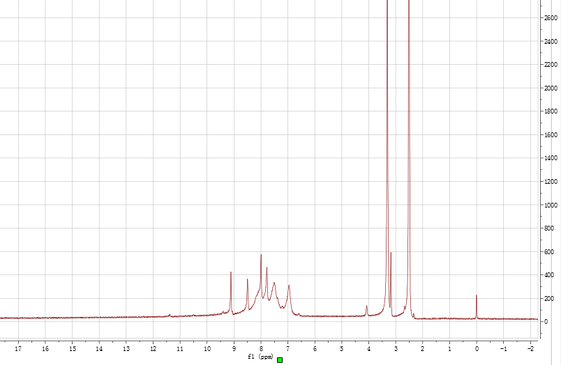 你的谱图大致符合你的化合物结构——所有的氢都在低场区。位于8.5~9.2之间的那两个峰可能是胺上的氢,剩下的应该就是苯环上的和剩下的那个氢了。