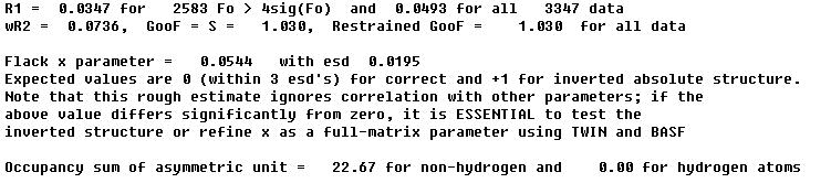 Flack参数我怎么找不到呢?在那里?请高手们把找到后的Flack参数复制下让我看看,究竟在那里,为什么我一直找不到呢?(我的晶体结构有一个手性中心,我是拿混旋体培养的单晶,这个单晶的具体构型不知是R,S还是R和S的混合体),分子中只含有C,H,O,N,Br MoK\a 方式测定。 如果没有Flack参数,但审稿人问我手性问题时我该怎么回答呢?急啊请高手帮帮我啊 LST文件如下 https://g.zhubajie.com/urllink.php?id=10772996qcw5fhr1g85ut9x8 cif文件如下 https://g.zhubajie.com/urllink.php?id=10772997ccjv1jdp84u97ob3 [ Last edited by baiyuefei on 2011-3-10 at 09:29 ] |