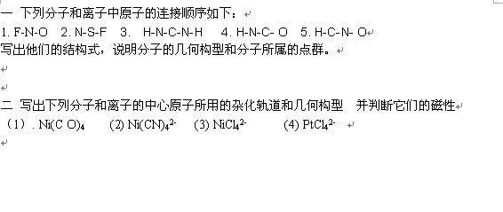小弟有两道化学题不会做,请广大朋友们帮一下吧,急盼解决,小弟金币不多以后攒起来肯定酬谢你的 一 下列分子和离子中原子的连接顺序如下: 1. F-N-O 2. N-S-F 3. H-N-C-N-H 4. H-N-C- O 5. H-C-N- O 写出他们的结构式,说明分子的几何构型和分子所属的点群。 二 写出下列分子和离子的中心原子所用的杂化轨道和几何构型 并判断它们的磁性 (1). Ni(C O)4 (2) Ni(CN)4 2- (3) NiCl4 2- (4) PtCl4 2- |