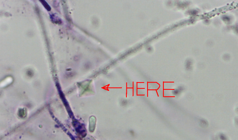 图中是液体培养蛹虫草菌丝体10x100倍照片,在观察菌丝体时无意中看到晶体存在,如照片中箭头所示,貌似为正八面体。