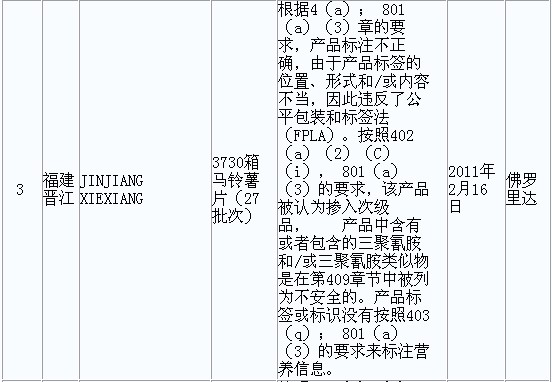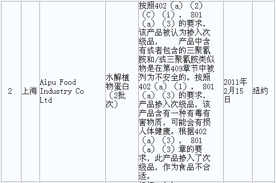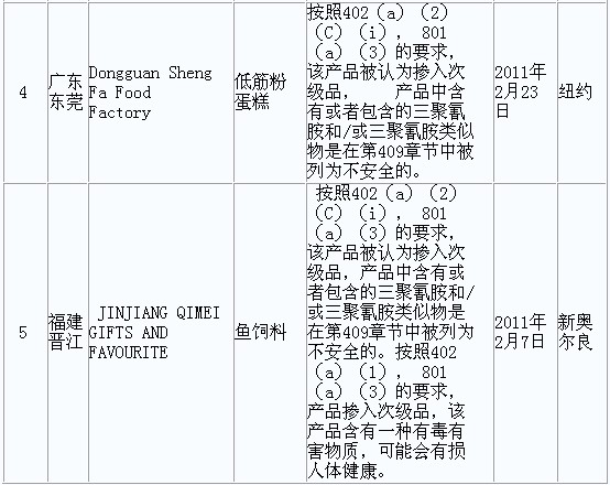 据美国FDA发布的2011年2月FDA拒绝进口食品情况,我国2月份共有56款食品被拒绝进口,其中有4款食品、1款鱼饲料检出三聚氰胺。 FDA原文详见: http://www.accessdata.fda.gov/sc ... &CountryCode=CN |
