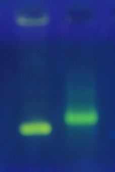 用1%的琼脂糖胶跑7500个碱基的DNA,sybgreen染色,第一个是单链的对照,目的是想在第一个单链DNA接上互补的链,想确定下第二个是不是已结成双链了