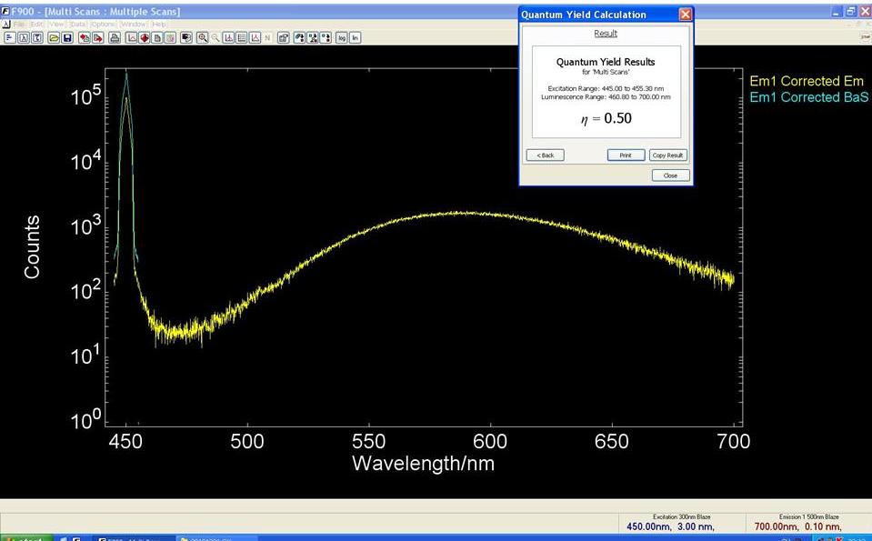 我们这里使用的仪器是FLS920。其他仪器测试量子效率的方法应该和这台仪器基本相同。 测量使用的积分球,使用硫酸钡作为参比. 测量开始时候,先使用荧光粉对于激发波长去激发硫酸钡.比如某荧光粉激发波长是450nm,那么用450nm激发硫酸钡,检测波长为445-455nm,测量好,换成样品,激发波长还是450nm,检测波长从445-800nm. 分别计算硫酸钡光谱,样品在445-455nm附近的面积,记为X1,X2,计算样品对于发射部分的面积,记为X3. 量子效率=X3/(X1-X2)*100% |