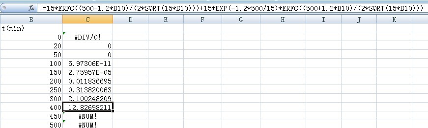 是的,改大点是可以得出结果,但是书中就是求500m处污染物的浓度变化过程。书中用matlab计算得出来结果,我用excel就计算不出,我是怀疑我用excel求解的时候是不是哪里有问题。