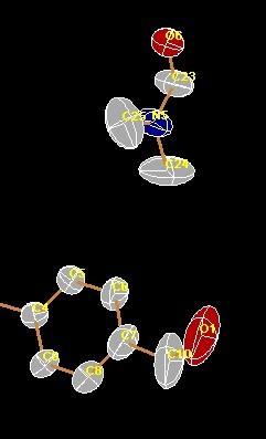 图中是我正在解析的晶体部分结构,左边部分是有机分子片断苯甲醛,右上有个DMF分子,应该是有C-H~O氢键作用,但我不理解的是为什么振动椭球会这么大?我如何继续精修?目前R1=1.1 R2=3.3 S=1.07.