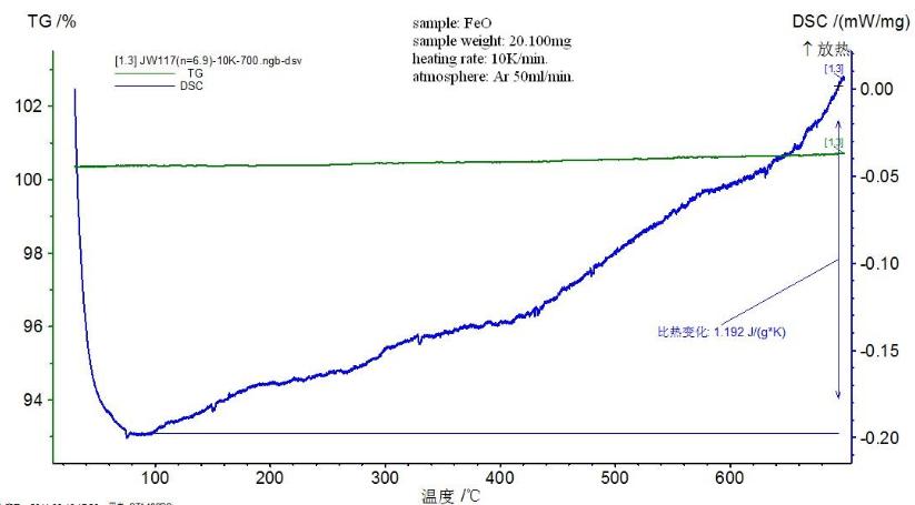 这个DSC图谱怎么分析? DSC考察亚稳定性的FeO歧化反应发生的温度: FeO=Fe+Fe3O4。焓变很小。耐驰TG-DSC仪器,气氛为Ar,升温速率速率是10K/min.得到的DSC图谱如下,请问该怎么分析呀? |