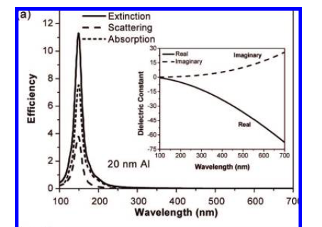 这两幅图反应的是Al的表面等离子体共振性质。表面等离子体共振会使局域电场增强,增强的倍数与他的共振频率和激发波长有关,第二幅图就是这个意思。表面等离子体共振会有比较有意思的消光现象,消光系数分为散射和 ...