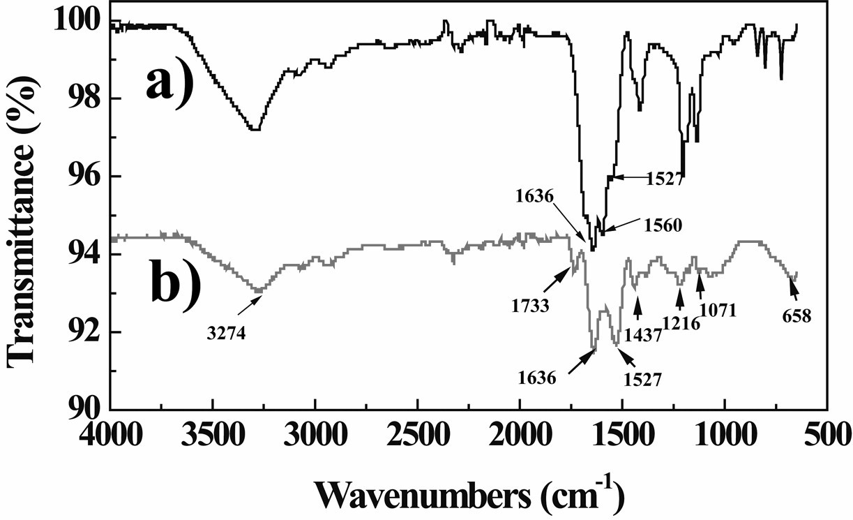 附图里面一个是方程式,一个是红外图谱。红外图谱里 a 是反应物的图谱。b是生产物的图谱。也就是将反应物的羧基进行了交联,反应使用EDC活化剂活化。在红外曲线b中,1732处的峰不知道怎么归属了,问了导师,导师也不会。我已经把b中 1636 和1527 分别归属为了酰胺Ⅰ键 (C=O)和酰胺Ⅱ键(C-N)。请高手指点。谢谢。