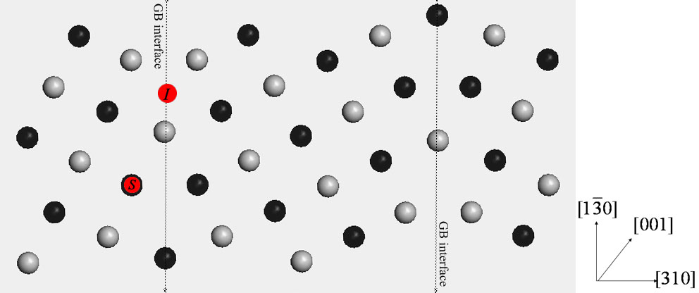 不知这些信息够不够,希望有高手可以不吝赐教,可再追加金币拜谢。下面的图就是啦,因为第一原理在X方向也考虑也周期性边界条件,所以有两个晶界,用MD就不用了。请忽掉一些红色的点。