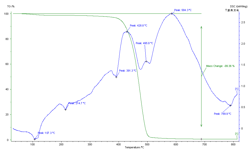 我没分析出这是什么材料,不过我把我能的信息给你看下。 1.从TG曲线上只有一个下降趋势得到这应该是个均聚物,共聚物的话会有不同的下降趋势。 2.从DSC曲线上可以看到,材料的Tg为107.3℃,Tf(或Tm)为214.7℃,因为这些对应的峰都为吸热峰,同时材料没有什么化学变化,TG曲线不会有很大变化。 3.把两个曲线一起看,就可以得出材料的Td为391.3℃,因为这时分解时材料的TG曲线会开始下降,而且分解是需要吸热的。 4.DSC曲线在Td之后的部分,应该是材料碳化后,结构发生变化,需要吸热或放热等,这个对材料的分析应该没什么影响,主要在前面的部分。 呵呵,这只是我的个人得到的信息,仅供参考。 |