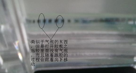 ×î½ü×öµçÓ¾·¢ÏÖÒ»¸öÆæ¹ÖµÄÏÖÏó£¬×ö½ºµÄʱºò¶¼ÊǺúã¬Ò²Ã»Óз¢ÏÖÓÐÆøÅÝ»òÊÇʲôµÄ£¬µ«ÔÚÅܽºµÄʱºòÔÚ·ÖÀ뽺²¿·Ö¾Í»á³öÏÖÒ»´®ÀàËÆÓÚÆøÅݵĶ«Î÷£¬ºá×ÅÓÐÒ»ÅÅ£¬¶øÇÒËæ×ÅÅܽºµÄ½øÐС°ÅÝÅÝ¡±»á¸ú×ÅÏòÏÂÒÆ¶¯£¬µ«Èç¹û´ò¿ª½º°å»á·¢ÏÖ½ºÉÏÃæ²¢Ã»ÓÐÆøÅÝ£¬¡°ÅÝÅÝ¡±¸üÀàËÆÓÚ½ººÍ²£Á§·ÖÀëÁË£¬²»ÖªµÀÊÇÔõô»ØÊÂ
