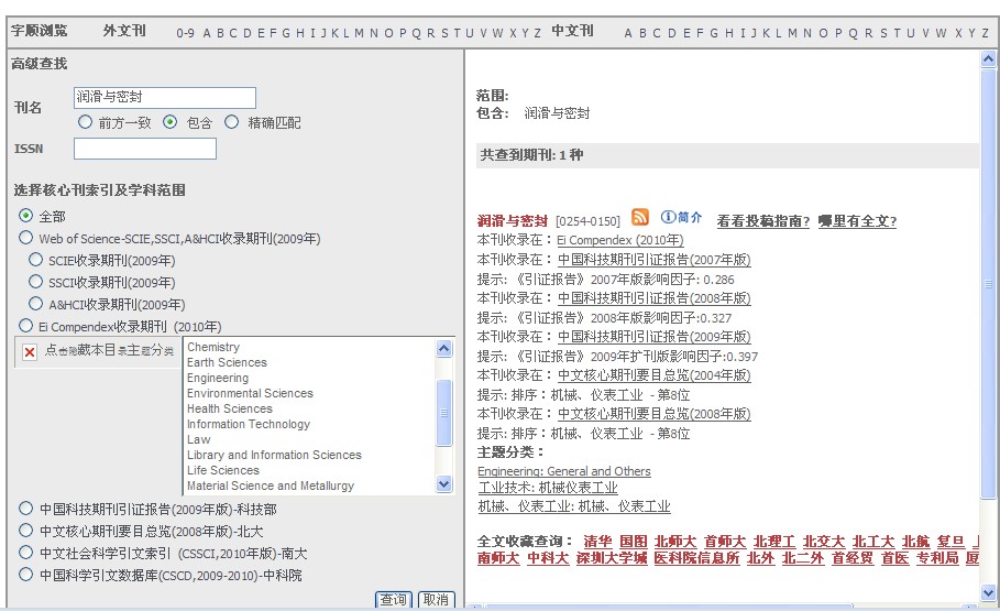 大家好! 今天我在上海交通大学核心期刊查询系统中查到 《润滑与密封 》被收录在本刊收录在:Ei Compendex (2010年) 网址:http://corejournal.lib.sjtu.edu.cn/findcoreej_sjtu.htm 请问是真的吗?谢谢 |