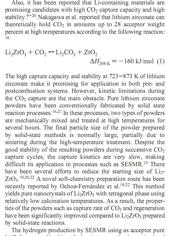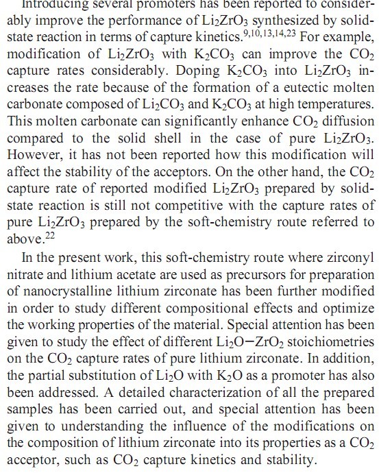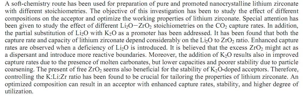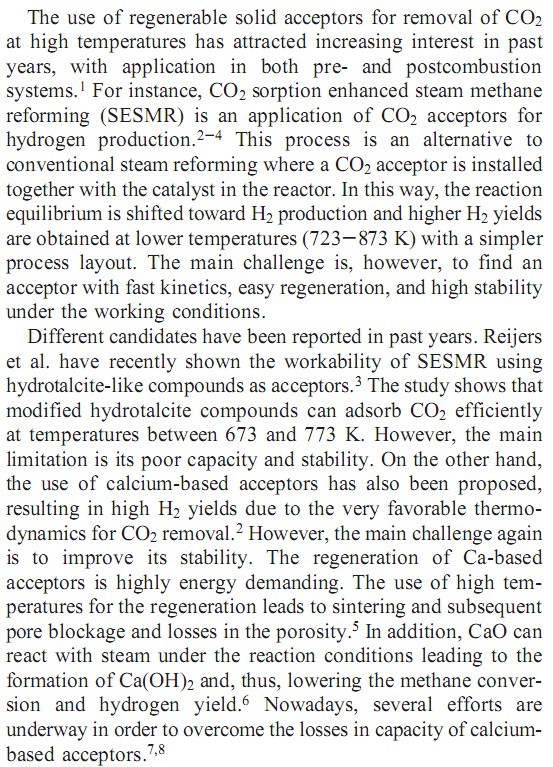 先来abstract和introduction第一段 摘要:本文用软化学的方法制备了不同化学当量比的纯的和改进的锆酸锂纳米微晶。本研究的目的是研究不同的组成对受体的影响并优化锆酸锂的工作性能,特别关注不同的Li2O-ZrO2化学当量比对CO2捕集速率的影响。此外,本研究也涉及用促进剂部分取代Li2O。研究发现,Li2O-ZrO2的化学当量比对锆酸锂的捕集速率和捕集容量均有很大影响。当Li2O含量不足时,捕集速率变快。我们认为过量的ZrO2可能起到了分散剂的作用,以此引入了更多的活性边界。 而且,K2O的加入会导致熔融碳酸盐的形成,从而也会引起捕集速率的增大;但掺杂K2O后的粒径变大同时也将导致捕集容量的降低和稳定性的变差。自由ZrO2的存在似乎对K2O掺杂的受体的稳定性有利,因此,调节三种元素的比值K:Li:Zr对调控锆酸锂的性质至关重要。最优组成也许可以使受体的捕集速率、稳定性和可利用率均有提升。 用可再生的固体受体在高温下去除CO2近年来为愈来愈多的研究者所关注,并在燃烧前和燃烧后捕集CO2系统中均有所应用。1例如,CO2吸附增强型蒸汽甲烷重组(SESMR)就是CO2受体材料在产氢领域的一个应用。2-4此过程相对于将CO2受体和催化剂一同置于反应器中的传统蒸汽重组另辟蹊径,它可以将反应平衡向产氢方向移动,并以较简单的工艺布局在较低温度(723-873 K)下获得较高的H2产率。然而,主要的挑战是寻找捕集速率快、再生容易、工况下稳定性好的受体材料。 过去几年中有文献报道了不同的候选受体材料。Reijers 等最近报道了以类似水滑石化合物作为受体的SESMR的工作能力。3研究表明,改进的水滑石化合物可以在673-773 K温度范围内有效吸收CO2。然而,该材料的主要限制是容量低,稳定性差。另一方面,亦有研究者提及钙基受体的应用,它们与CO2的反应在热力学上非常有利,因此可以提高H2的产率 。但是,钙基受体所面临的主要挑战还是稳定性有待提高。钙基受体的再生过程需要耗费大量能量,再生过程中用到的高温也会导致烧结,进一步导致孔道堵塞和孔隙率降低。5此外,CaO可以与水蒸汽反应生成Ca(OH)2,降低甲烷的转化率和氢气产率。6 目前,许多研究者致力于克服钙基受体的容量损失问题。7,8 |