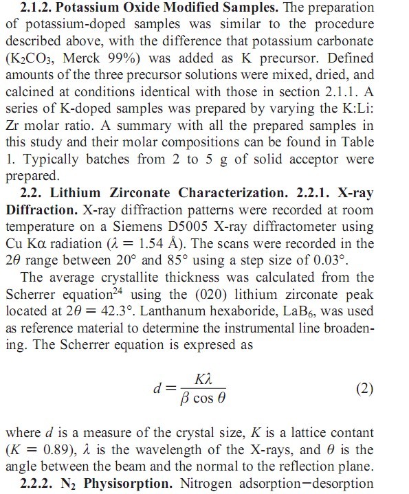 余下部分: 此外,亦有文献报道拥有高CO2捕集容量和高稳定性的含锂材料是有潜力的候选材料。9-20Nakagawa 等指出,根据下式,理论上锆酸锂高温时可以吸附高达自身重量28%的CO2. (式子略) 锆酸锂在723-873 K范围内的高捕集容量和强稳定性使它在燃烧前和燃烧后捕集CO2系统中的应用前景光明。然而,捕集CO2过程中动力学的限制是它的主要障碍。传统上纯的锆酸锂粉末是由固态反应过程制得。16,21.在这些过程中,两种粉末机械地混合,并在高温下处理几小时。由固态方法制得粉末的最终粒径一般很大,部分原因是高温处理时的烧结作用。尽管这些粉末在连续的CO2捕集循环中的良好稳定性,它们的捕集速率却很缓慢,使它们在类似SESMR过程中的应用变得困难。10已有许多研究致力于减小锆酸锂的起始粒径。19,20,22.Ochoa-Fernandez 等最近报道了一种软化学的制备方法。此法可以在相对较低的煅烧温度下产出四面体相的纯锆酸锂纳米晶体。因此,与固态反应制得的Li2ZrO3相比,这种粉末的一些性质,例如CO2的捕集速率和再生性,显著地提高了 据报道,促进剂的引入可以显著地改善由固态反应合成的Li2ZrO3在捕集动力学方面的性能。9,10,13,14,23.例如,用K2CO3修饰Li2ZrO3可以显著提高其CO2捕集速率,这是因为K2CO3掺杂到Li2ZrO3中可以在高温下形成由Li2CO3和K2CO3共熔的熔融碳酸盐。与纯Li2ZrO3相比,此共熔碳酸盐可明显增进CO2的扩散。然而,这种修饰如何受体材料稳定性产生影响却未见报道。另一方面,在CO2捕集速率上,已报道的由固态反应制得的修饰过的Li2ZrO3还尚不能与用上文所说的软化学方法合成的纯Li2ZrO3相提并论。 本研究进一步改进了以硝酸氧锆和醋酸锂为前体制备锆酸锂纳米微晶的软化学方法,以研究不同组成的影响和优化受体材料的工作性能。我们尤其关注不同的Li2O-ZrO2化学当量比对纯Li2ZrO3的CO2捕集速率的影响。此外,本研究也涉及用促进剂K2O部分取代Li2O。所有制备的样品均经过详尽的表征,而锆酸锂组成的修饰对其作为CO2受体的性质(如CO2捕集动力学和稳定性)的影响则得到了特别的关注。 2.1.2 氧化钾修饰样品 钾掺杂样品的制备过程与上面的步骤相似,不同之处在于碳酸钾(K2CO3,Merck, 99%)作为K的前体被加入。一定量的三种前体溶液在section2.1.1所述的条件下混合、干燥、煅烧。改变K:Li:Zr的摩尔比,制备了一系列的K-掺杂样品。表1总结了本文所有制备样品和它们的摩尔组成。每次所制备的固体受体的量一般在2-5 g. 2.2 锆酸锂表征 22.1 X射线衍射 X射线衍射谱图于室温下在 Siemens D5005 X射线衍射仪上收集,X射线源为 Cu Kα射线(λ=1.54 ),扫描范围为2θ20-85,步长 0.03 平均晶体厚度采用2θ=42.3处的(020)锆酸锂衍射峰结合Scherrer方程计算。用六硼化镧,LaB6,作为标准物质测定仪器的线宽。Sherrer方程 (略) 式中,d 指晶体尺寸,K 是晶格常数(K=0.89),λ是X射线的波长,θ是X射线和反射面法线的夹角 |
