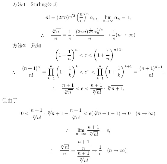 [img]http://latex.codecogs.com/gif.latex?\lim_{n&space;\to&space;\infty&space;}\frac{\sqrt[n]{n!}}{n}=[/img] 为什么显示不出公式啊 晕死 分子是n!的n次方根, 分母是n, 对此分式求极限,当n趋于无穷大的时候 [ Last edited by smf2828 on 2011-3-23 at 20:01 ] |
