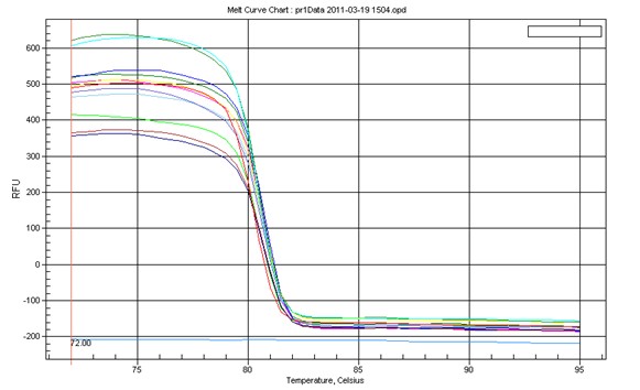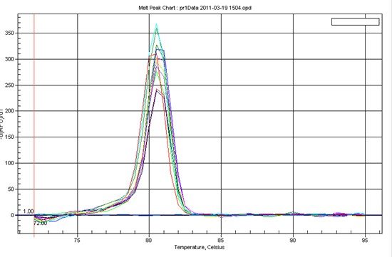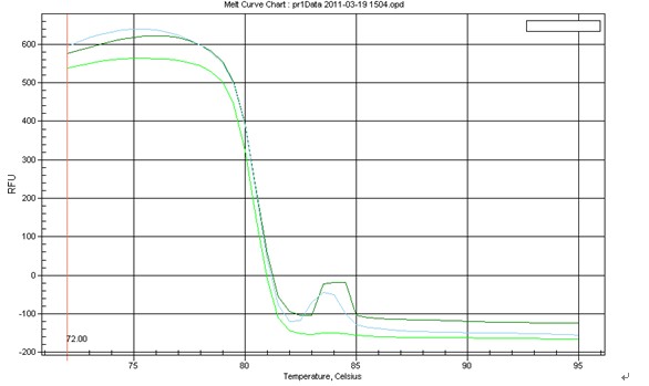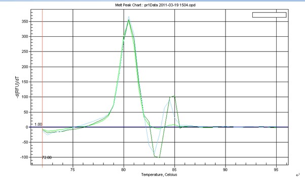 融解曲线有突峰,是什么原因?请各位大侠指点! 前面两张图为正常的融解曲线图跟融解峰图,但后面两张就出现了不正常,融解曲线有突起! [ Last edited by caijhua on 2011-3-24 at 15:20 ] |
