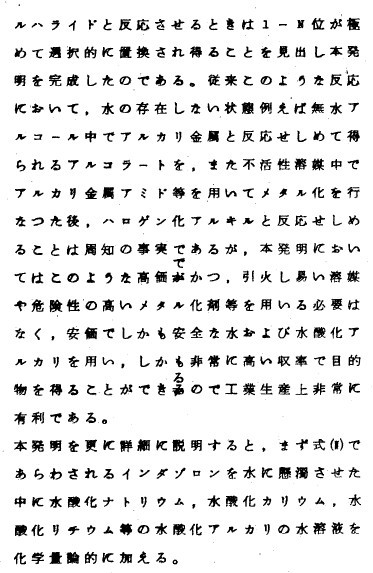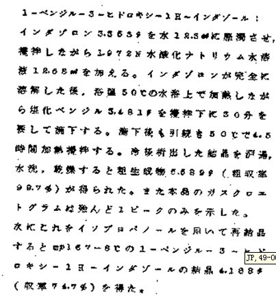 | 1-苄基-3-羟基-1H-吲唑 (1-Benzyl-3-hydroxy-1H-indazole): 将吲唑酮(indazolone)3.353g 溶于28.3ml水中形成悬浮液,一边搅拌一边加(看不清)的氢氧化钠水溶液12.65ml。待吲唑酮完全溶解后,在50度的水浴上加热并一边搅拌一边滴3.481g的氯苄(benzyl chloride)持续30分钟。滴定完毕后继续在50度下加热搅拌4.5个小时。过滤冷却析出的结晶,水洗,干燥获得粗产物5.589g(粗收率99.7%)。该物质的GC显示!@#(看不清)只有一个峰,接着用异丙醇(isopropaanol)再结晶得到!@#$$(看不清)的1-苄基-3-羟基-1H-吲唑 (1-Benzyl-3-hydroxy-1H-indazole)的结晶4.188g (收率74.7%) |