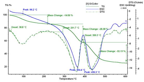 做的是一个黄酮金属的配合物,可能含结晶水和配位水。。。刚接触热分析,不太懂。。从图上看,是不是可以这样理解:1,存在三个失重阶段。显示peak 96.2 失重14.06%这个阶段是配位水的失去? 2.那第二个位于三百多度的吸热失重是啥呀? 3. 第三阶段四百多的,我可以理解为该配合物的分解吸热吧。 |