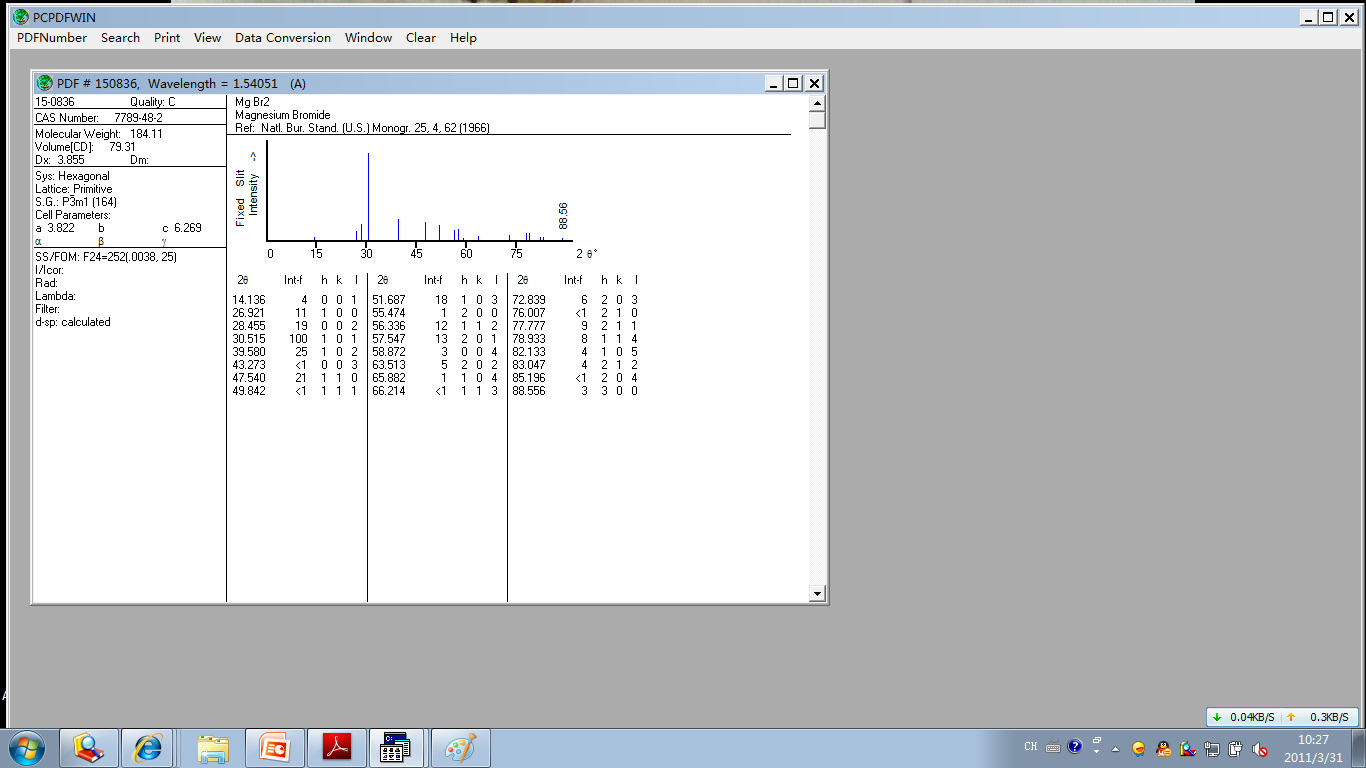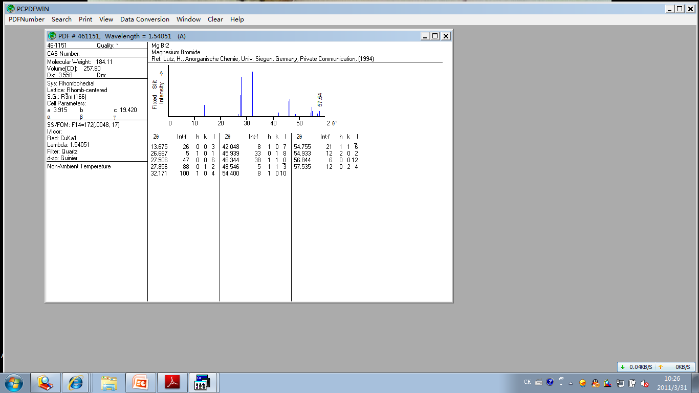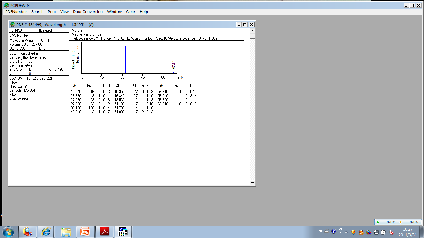 guangmin2807(金币+5, 博学EPI+1): 非常感谢您的帮助,还有一个问题想向您请教,为什么溴化镁会有三个PDF卡片呢?有什么区别吗?我要是进行比较鉴定的时候应该用哪个比较好呢? 2011-03-31 11:25:16