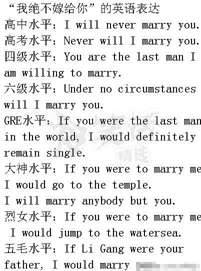 ![]() ![]() I will always marry you. always will I marry you. You are the first woman i am willing to marry . Under any circumstance , will i marry you. If you were not the last woman in the world . i will definitely remain single. I f you were not to marry me I would go to temple. I will marry nobody but you. If you were not to marry me. i would jump into the watersea. If ligang were your father. i would have married you thousand times. ![]() ![]() [ Last edited by holypapa on 2011-3-31 at 08:28 ] |