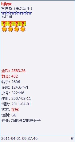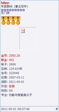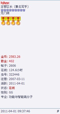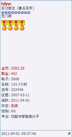| 我今天的身份总共变了三次,一会管理员,一会版主,一会专家顾问,搞什么啊?我只要做一个小虫虫就好了。 |