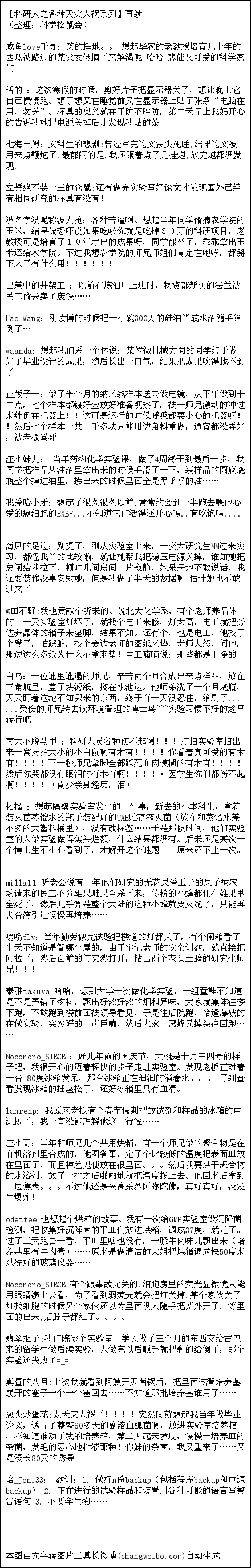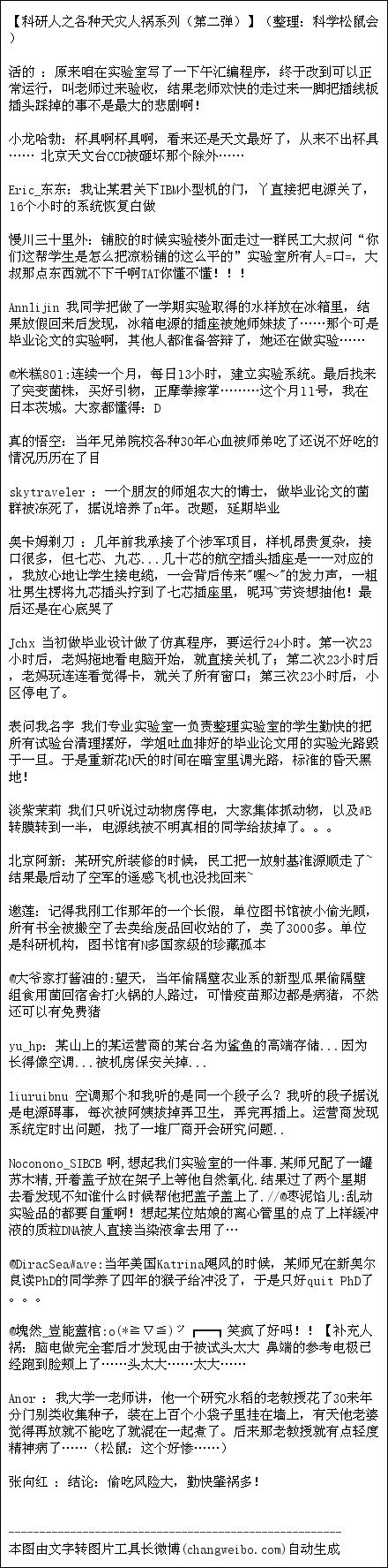 转自-豆瓣,(整理:科学松鼠会) 山要:多年前,有个研究所雇了个打扫卫生的临时工。一天,这个临时工进到动物房打扫时突发奇想,说你们这些做科研的怎么做事这么不仔细。有些笼子里面10只老鼠,有些笼子才一只,多不合理。于是他动手把老鼠的住房问题调整了一下。最后…他被开除了,那个研究所几乎所有实验组都在怒吼。 金仆姑:想起十年前给农科所盖房子的农民工师傅嘴馋偷了农研培育的葡萄,偷了…一筐… n代的都混在一起…多年心血混在一起…农研的怒吼…判多少年不知道…… 老兔哥哥 :话说某年某医学院一只做实验的羊越狱了,据说刚刚注射了某病毒,医学院到处贴大字报通告,然后全城的卖羊肉串的恨不得把医学院的人都拉出来烤了 静岳隐岚 :想起糗百一贴:很久很久以前,有两个小偷潜入一内地医学院,偷了两只实验用狗,然后美美地吃了一顿狗肉火锅。后来他们被抓住了,院方清算学校损失后,法院判处了二人无期徒刑,原因是:他们吃掉的两只狗,是医学院做实验要求清白遗传而专门从德国进口的纯种牧羊犬,价值十二万美金....注:当时教授月薪为70元 天涯砍刀 :想起那个打扫高危病房拔插头的段子 另 @金仆姑 说的那个 也碰到过民工偷进农研所 把价值约数百万的豆角偷出来上早市卖了一百元 厕所没纸怎么LA :我们院的混凝土试块,曾经在月黑风高的夜里被院里的花匠搬走垒花圃了。。。 民工鸟 :假装做陶瓷烧结实验,偷偷用三氧化二铝粉末埋地瓜放到电阻炉里面烤,被不知情的小师弟按实验规程调温至1500°C+……最后烤出一堆碳结晶来…… 萝卜小白菜 :小时候,清华200号周围的农民偷实验材料当洗衣粉。那个实验材料含荧光剂,结果这些农民晚上出来时都跟鬼影似的。那时农村里路灯很少很暗,晚上常能看到飞舞的萤火虫。 裤子和她的朋友们 :之前新闻说四川有个家伙出车祸,把车开到了农田里,砸坏了一大片——杯具在于农田是袁隆平的试验地。 黑米团子911:这个的确很悲催,就像我们上大一去果园帮忙,一家吃了两个李子,被教授发现了,逼着我们找回李子核,并且每人假期果园劳动10天。后来才知道,那我园林系的老师多年的心血。唉~~科研单位的农基地不要随便进啊!!!! S_Patti:我们版房修线毛的阿姨,会把故意洗破的牛仔裤raw edge都修干净...牛仔裤就会出现好多个干净窟窿 西瓜踢足球:比我画一晚上场景结构图第二天发现被清洁大妈扔了还惨.. 川-HC 我想起了清洁阿姨拿着一块抹布,把所有桌子都抹了个遍,那叫一个干净~~~ 其中包括电泳区...EB... 老板咆哮了 archy_chen:据厦门大学的师姐说,有保洁阿姨把放在窗台上的都长满绿色苔藓的装水锥形瓶用洗衣粉洗得干干净净,结果里面是人家高价买来培养的球藻,放在那里晒太阳的 不辣的娘皮 :有个同事把所有试块很欢乐的用蜡笔标上编号,然后那去烘箱烘,之后她就哭了~ 花草水语暖暖缘 :有个DD也很惨。。。快过年的时候他还没回家,问他为啥,他说~我的鸡蛋还没死完。。。导师说死完才能回家。。。 豌豆shooter :那比我们赫然发现昨天按种属分好的骨头今变成按部位分的凄惨的多啊 回家的细菌:这个......比我做PCR第二天早上发现PCR仪里面多了一个PCR管的经历还惨 米医生 :的的确确是晴天霹雳…还有出去吃个饭回来发现恒温箱里的试管被好心的保洁阿姨摆出了美丽图案…… 派出所值班那点事 :想当年某单位冲了个毒窝,验尿,每个嫌疑人一瓶子,结果抽空打扫卫生的阿姨闻见臭味:“哎呦,赶紧扔了~”… 灵猫大法师 :某博士做合成,花了三年打通一条路线,包含了十几个反应和处理步骤,终于某日傍晚得到目标产物若干毫克(尚未做分析检测)。称重后放在称量纸上去记数据。结果。。。清风吹来,将纸吹翻。。。哭死。。。 青蔷天:我老板问,这是什么,然后一把就把线给拔了。。于是我周期30天,做到21天的,每天做17小时的实验就这么毁了。。。。。 麦多妈:高中时一个同学的老妈在家里看到一支硬笔书法笔,心说这笔尖怎么翘起来了,就好心地找来一把钳子硬是给掰直了…… 古杨树 :跑24小时计数实验时被某人为了试有没有电把计数箱关了又开好吧我承认它长得像变压器 旺莫西林 做模型分小块喷漆的时候,上了个厕所,回来所有的待干零件都进了门外的垃圾袋……钟点工还说她没碰过啊没碰过 allthepast:太惨了……想起听说过的某实验室的本科生OR研一新生勤快刷了几个瓶子,里面是老板辛苦从世界各地弄来的浮萍材料…… |