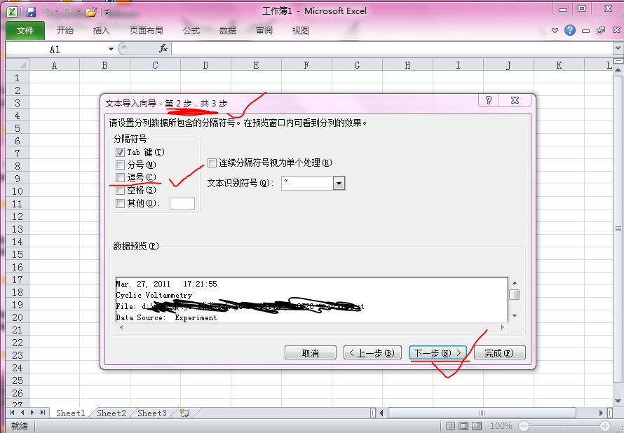 辰华的数据用TXT导出后...如CV曲线的数据...U和I的数值是在同一个TXT行里...复制到EXCEL里时..两个也在同个单元格里..想问问用什么方法能够方便把他们分开...谢谢大家了