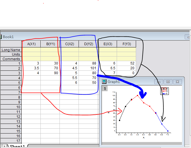 你注意一下数据表的表头,其中A、C、E三列分别为横坐标X1、X2、X3,它们对应的纵坐标分别为B(Y1)、D(Y2)、F(Y3)。这个是需要你自己设置的,方法是分别用右键单击C、E列的表头,在弹出菜单里选择“set as……”----->"X ”,然后就定义好三个横坐标了。