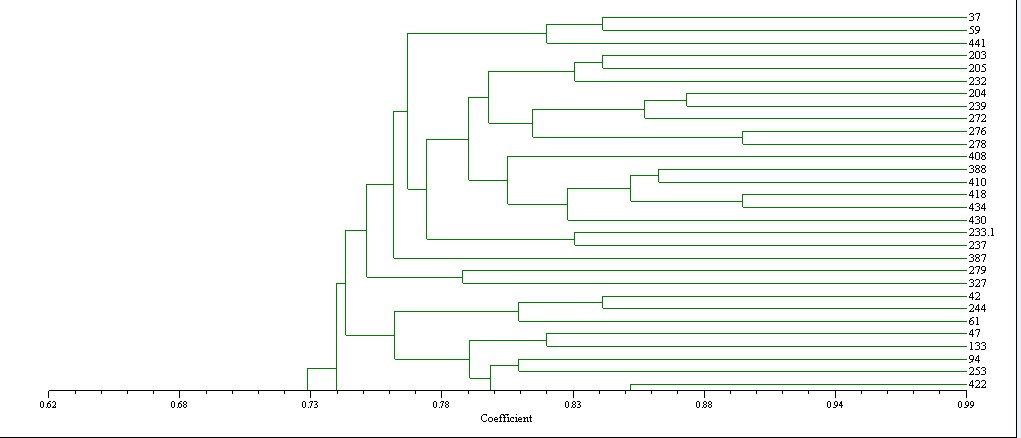 NTSYSpc-2.1做出聚类图后怎样画一条线!!!我现在图的0.73处画一条线,但是系统化线自动在中间0.83处划线,也不能移动,不知大家怎么弄得?而且则样计算它的平均遗传相似性系数,俺不会算啊,急求啊。 |