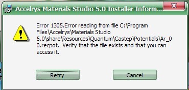 Installing materials studio 5.0 copying new files 时跳出这个窗口,查过很多资料都没有提过这个问题,请各位高手指点一二。