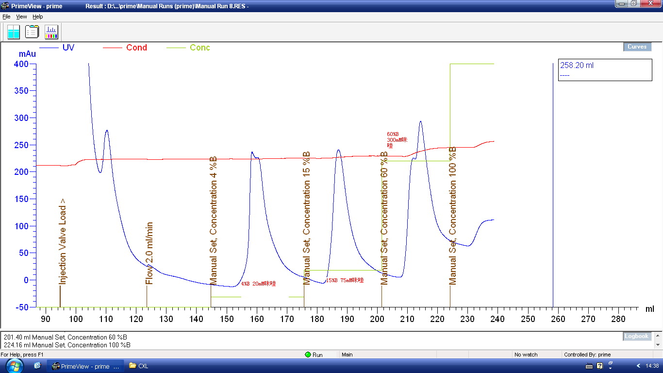 大家好,请看看附件中我的HIS标签蛋白纯化的结果正常吗? 1:请问,我的蛋白20mM的时候就出峰,是因为我的蛋白挂柱能力差,还是柱子过载? 2:75mM咪唑浓度时候,300mM咪唑浓度时候,都出现了尖峰,这是为什么呢? 3:我的三个梯度,20mM咪唑,75mM咪唑,300mM的咪唑浓度是否合适》? |