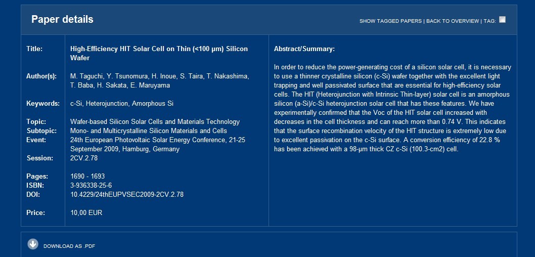 文章题目:High-Efficiency HIT Solar Cell on Thin (<100 μm) Silicon Wafer 作者:M. Taguchi, Y. Tsunomura, H. Inoue, S. Taira, T. Nakashima, T. Baba, H. Sakata, E. Maruyama 关键词:c-Si, Heterojunction, Amorphous Si 其他信息:24th European Photovoltaic Solar Energy Conference, 21-25 September 2009, Hamburg, Germany 摘要:In order to reduce the power-generating cost of a silicon solar cell, it is necessary to use a thinner crystalline silicon (c-Si) wafer together with the excellent light trapping and well passivated surface that are essential for high-efficiency solar cells. The HIT (Heterojunction with Intrinsic Thin-layer) solar cell is an amorphous silicon (a-Si)/c-Si heterojunction solar cell that has these features. We have experimentally confirmed that the Voc of the HIT solar cell increased with decreases in the cell thickness and can reach more than 0.74 V. This indicates that the surface recombination velocity of the HIT structure is extremely low due to excellent passivation on the c-Si surface. A conversion efficiency of 22.8 % has been achieved with a 98-μm thick CZ c-Si (100.3-cm2) cell. 此文相关信息的一个网络链接:https://www.eupvsec-proceedings. ... ar=H&paper=4112 [ Last edited by liuronglin on 2011-4-15 at 19:16 ] |