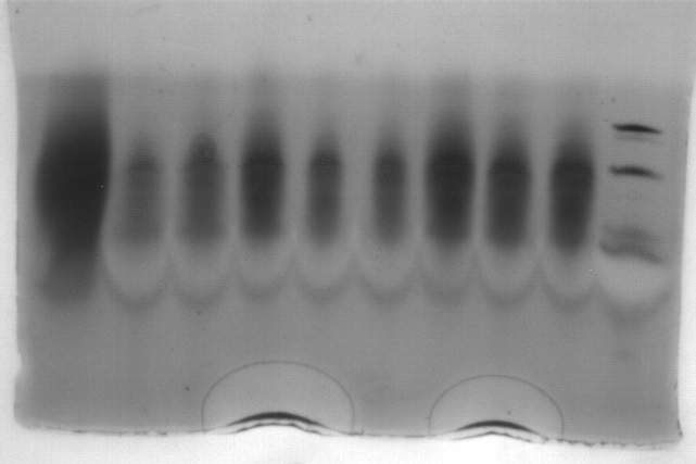 染色液和脱色液可以用普通胶的染色液和脱色液,染色和脱色时间不要过长了,染色之前一定要用固定液进行固定,以防小分子弥散了,染色液有很多中,我用的是乙酸铵,楼主可以试试,我跑出来了,条带很清晰 |