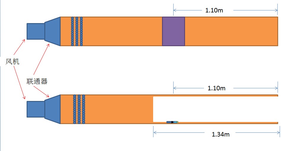 我做了一个小型风洞,截面为0.6m*0.42m,一端为风机,直径为0.40,自加工一个联通装置连接风机和风洞的端口,风洞内靠近风机的部分加了四页蜂窝芯板整流网,各页蜂窝芯板间距为10cm,单个蜂窝芯小孔为六边形状,厚度1cm,边长0.5cm,密度很大。