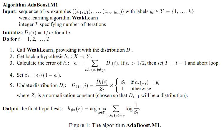 这属于边界处理吧,难道训练错误率为0时取beta=0?那你最后如何对这个弱分类器的beta取倒数? 此时你可以根据数据集的具体情况设定错误率为一个很小的数值,例如0.001,计算beta。观察样本权重更新就可以知道,此时所有样本权重都需要乘以beta,beta取任何非0值都一样的,而且这样的边界处理也符合adaboost的原理:没有错分,自然不需要对权重进行进一步调整。反而是beta取0显得不合理,因为这样会使得所有样本等价(不要太执着权重为0,从权重更新的根本目的考虑,所有样本权重为0和所有样本权重为1在这里没有什么区别的)。样本权重相当于没有改变,而该弱分类器权重较大。但是因为算法并不因此停止,如果还有其他弱分类器也能达到训练错误率0,也同样会有较大的权重,从而避免由单个弱分类器完全决定强分类器的情况。 |