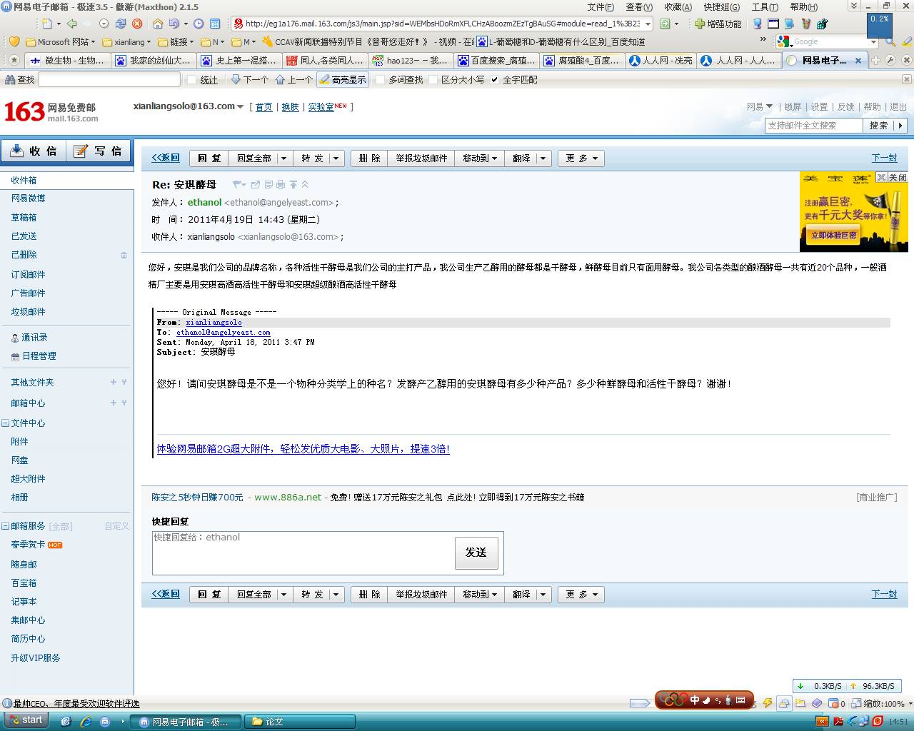 安琪酵母并非分类学上的名词,而是安琪公司所产的一类产品,安琪公司的网址为 http://www.angelyeast.com/default.aspx 商品包含有很多种 http://shop.angelyeast.com/?gallery-_ANY_,16-b,_ANY__t,_ANY__p,0-0---42-grid.html 所用的酵母可能分类学上都不同,每种商品可能只含有一种也可能含有多种酵母。上面商品展示的网页上最后一个商品“安琪耐高温酿酒高活性干酵母500克”主要含有酿酒酵母。 今天安琪公司给我的回信回来了,大可鉴别一下真伪。 [ Last edited by 冼亮淀粉酶 on 2011-4-19 at 14:58 ] |