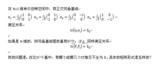 从你给定的基出发,基本上明白你所谓的希尔伯特空间是什么了 不过,这个正则完备基是唯一的吗?如果不唯一,你如何说明基中有哪些对解元不全为零。 如:n=2时,如果设你给定的基就是a,b,c,d四个,则a+b,a-b,c,d单位化之后应该还是原空间的正交基,并且还满足你给定的条件和矩阵对角线上元素不全为零比你给定的基多了一个。所以你问空间的基中有多少个对角线上元素不全为零就没有多大意义了。 你是不是想问:如何来构造这个空间的一个单位正交基啊? 实际上这个基容易构造,只需要找到n维实对称矩阵空间的一组单位正交基(A_i)和n维实反对称矩阵空间的一组单位正交基(B_j)。 由于任一矩阵都可以表示成对称矩阵与反对称矩阵之和的形式,则上面两组基总数一定是n^2个。 根据A_i为对称矩阵的单位正交基可知trac{A_iA_j}=delta_{i,j},同样trac{B_iB_j}=delta_{i,j},再根据A_i对称与B_i反对称得trac{A_iB_j}=0 再由所谓的“希尔伯特空间”的维数。令A_i, sqrt(-1)B_j。可以说明上述单位矩阵属于这个空间,个数n^2个,不同的两个正交,满足你给定的式子。 |