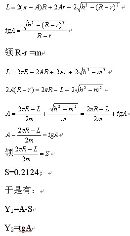 见图片: 如何求解这样的方程组,内含两个未知数,其中一个是角度,求matlab高手给出详细编程过程,其它求解过程也可以,只要给出详细的求解过程即可。 其中:L,R, r为已知, L=3600,R=600,r=200,求h和A 只有结果不予奖励,小木虫藏龙卧虎,期待高人指点!!! |