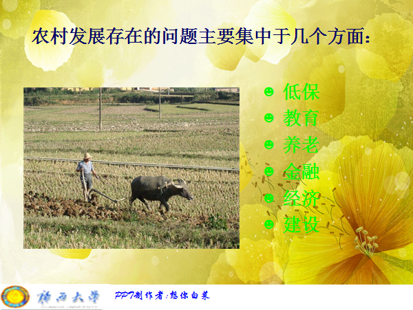 嘿嘿。这个是作业啦,当然也是整合资料。不过原材料不是我搜集的,是同学一起合作的,PPT主要是我做的 。。。。。。其中的主要内容呢就是有关农村现有的发展遇到的问题,也涉及到新农村的发展。。。。。。![]() [ Last edited by wlkpf on 2011-4-20 at 19:07 ] |