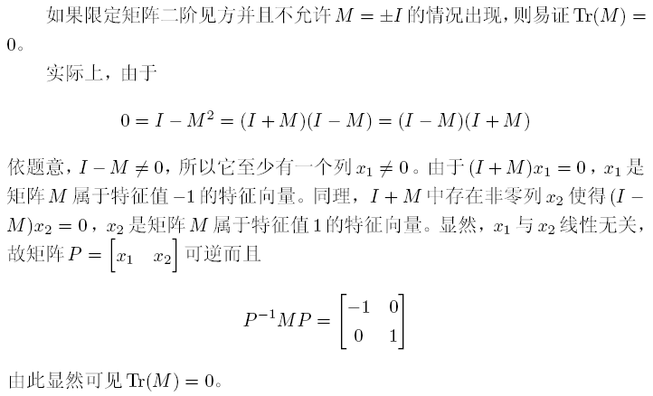 问题如下: 对于一非单位矩阵 M(矩阵的维度是任意的),满足M^2=1 (单位矩阵),那么trace{M}一定等于零吗? 我试了好几个满足条件的M,好像取迹都为零,但不知如何证明,求教大家了 p.s.本人数学实在 ![]() [ Last edited by Danielxu on 2011-4-21 at 14:03 ] |
