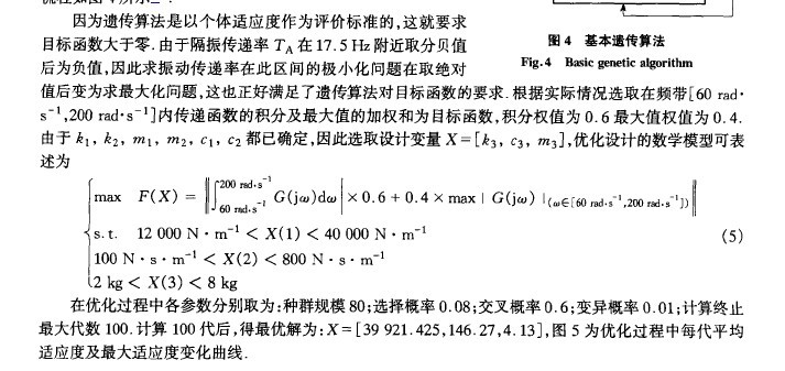如题,小弟刚接触遗传算法,很是看不懂,数学模型在这儿了,哪位大侠写个程序或者给个与此模型相似的例子的程序,万分感谢 小弟做的是带吸振器的两级隔振系统参数优化设计,上面的模型是别人做的,但没有程序,而我需要在此模型基础上进一步加吸振器,所以必须得有此模型的程序,求高人好心人~ |