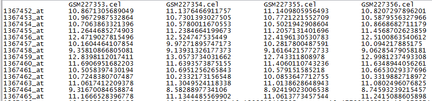 看到文献上介绍 “GSE8988” (在 NCBI 里下载的 ) 这个 gene 表达数据文件里,是 1269 个gene 在 18 个time-point 的采样数据,我下载 GSE8988 并用 Bioconductor 归一化处理后,数据格式的形式见下图。第一个问题是 诸如 探针 ID “1367452_at” 这样的编号和基因是怎么对应的? “1367****_at” 这样的编号有五千多个,基因个数是1269个? 发现有的基因对应一个编号,有的基因对应数个 探针 ID编号, 这里面的有规律吗? 第二个问题: 第一行的编号 “GSM2273** .cel” 应该是和 采样时间点 对应的吧? 怎么看出这种对应关系? 我看了有关这个文件的相关说明 (http://www.ncbi.nlm.nih.gov/proj ... acc.cgi?acc=GSE8988 ),没找到和以上两个问题相关的介绍,困惑,请熟悉的虫友指教,先行谢过。 [ Last edited by yanruoke on 2011-4-26 at 19:27 ] |