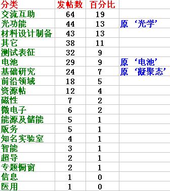 1.前沿领域2.交流互助3.材料设计与制备4.测试表征5.资源帖 5.凝聚态7.光学8.电池9.超导10.智能 11.微电子12.信息13.能源及储能14.医用15.磁性 16.专题橱窗17.知名实验室18.其它19.版务 你们目前的板块分类很凌乱,标准不一。既有按照帖子类型的分类,也有按照材料方向的分类。建议不要将面摊的太广。可以按照材料分类进行分块,然后在标签中具体选择资源,版务,交流,互助,其他等等 主要的板块还是以具体的方向分类比较好 |