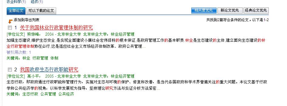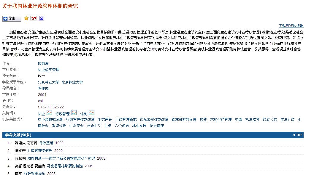 各位老师和同学,如果您有资源,请帮我下载一篇文献,提供链接即可,谢谢啦。 1、关于我国林业行政管理体制的研究 熊惊峰, 2004 - 北京林业大学 北京林业大学:林业经济管理 |